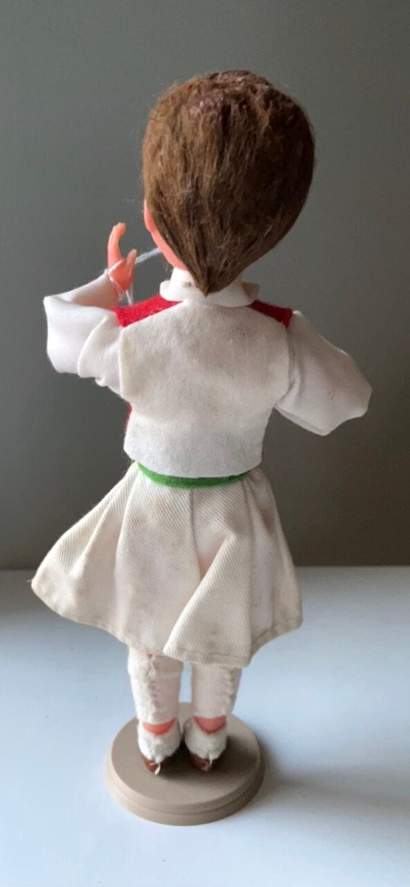 This unique doll is in good condition as shown. It is made with incredible detail. It measures approx. 9" tall. It stands on a base which is signed on the bottom as shown in the pics.
