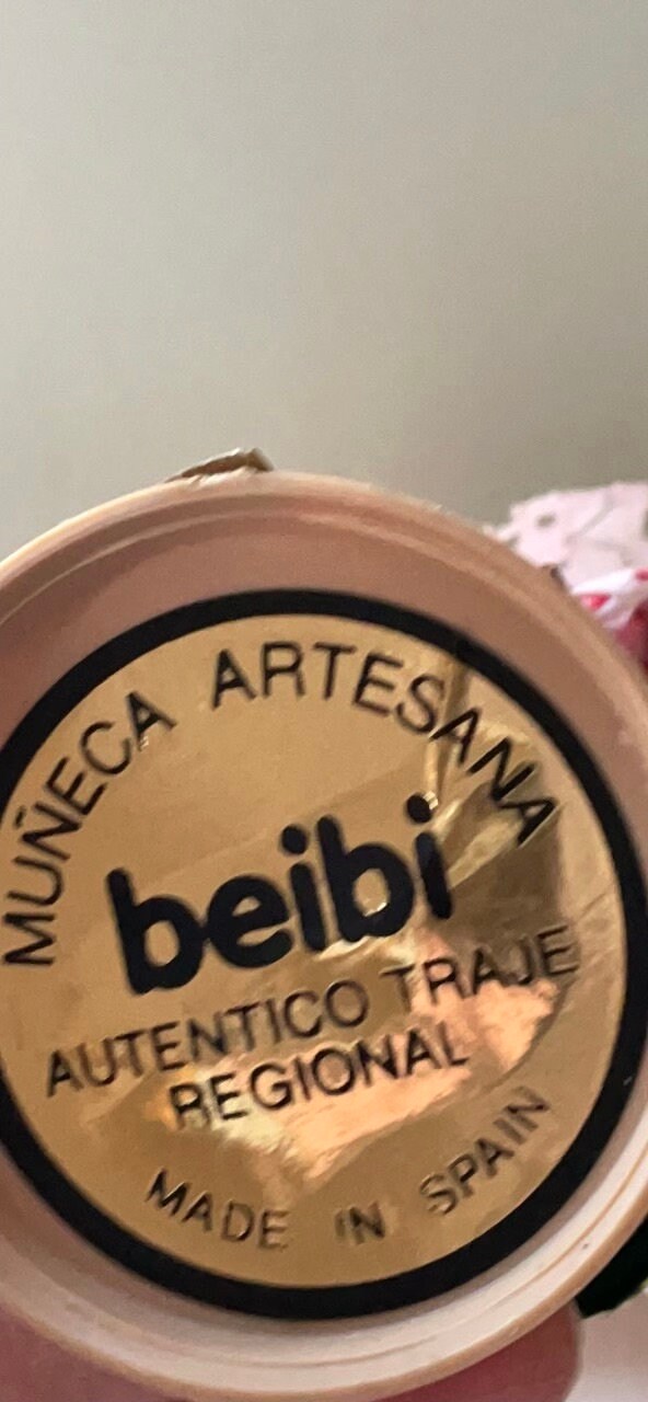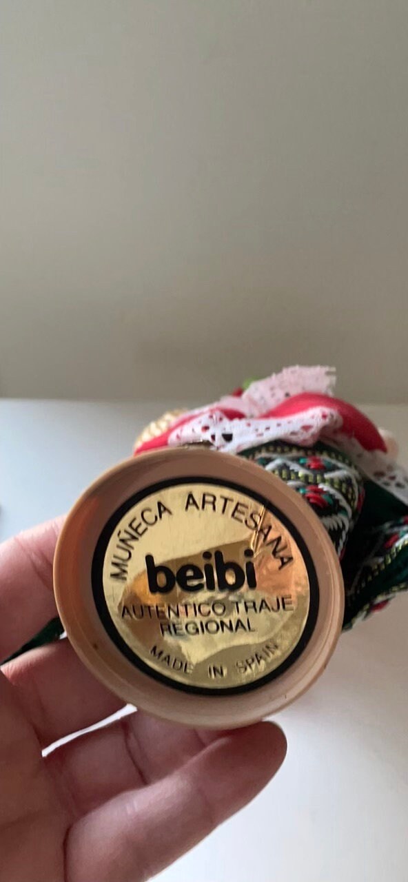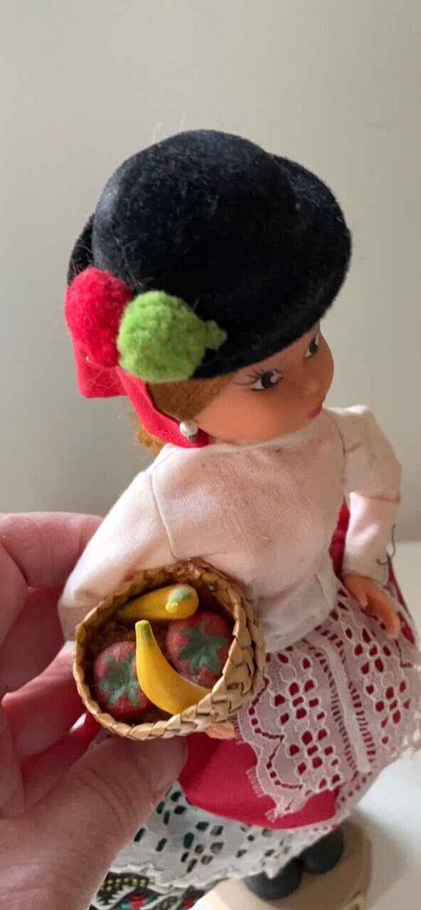 Vintage signed Muneca Artesana Beibi doll figurine - Made in Spain - holding wicker basket with miniature fruit